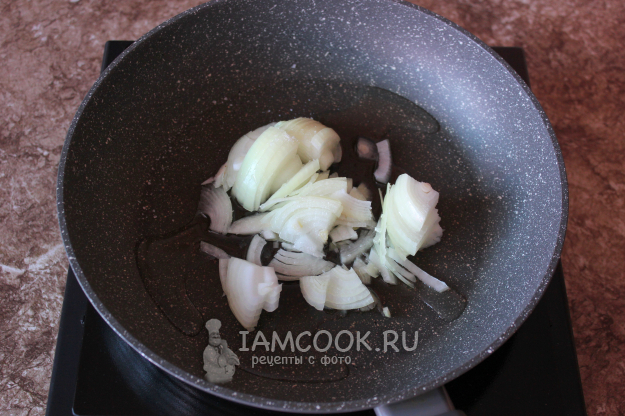На среднем огне на сковороде со сливочным (растительным) маслом или на жиру потомите нашинкованный лук при помешивании минуть 5.