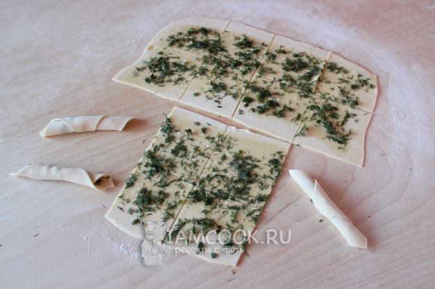 Пока готовится мясо, вернитесь к тесту. Раскатайте его в тонкую прямоугольную заготовку. Смажьте поверхность теста растительным маслом с измельченным чесноком и посыпьте свежим рубленым укропом. Нарежьте подготовленное тесто на квадратные заготовки и скрутите их рулетиками от одного угла к другому (или трубочками как-то иначе).