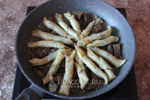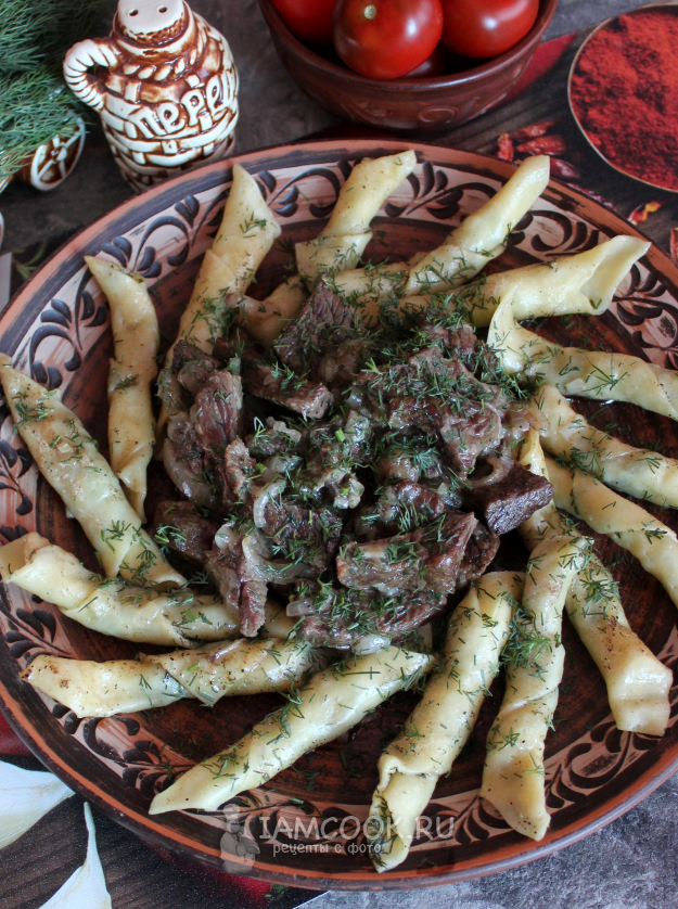 Жайма по-казахски из тушеной говядины с ароматными трубочками из теста – вкусное, сытное, аппетитное и по-своему симпатичное блюдо.