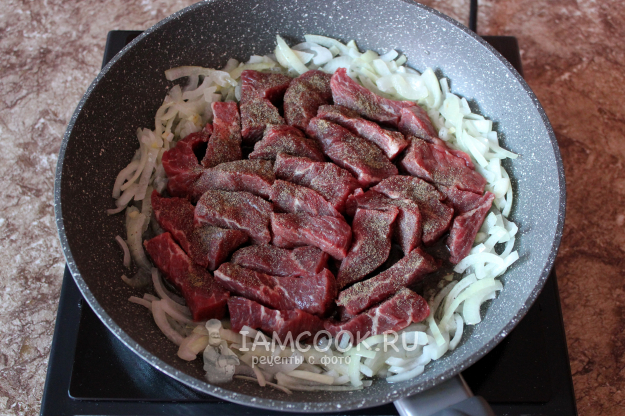 Затем лук сдвиньте и добавьте на сковороду кусочки мякоти говядины. Соль и перцы – по вкусу. Обжарьте всё вместе около 5 минут на сильном огне, помешивая. Затем подлейте немного горячей воды, убавьте огонь до слабого и тушите мясо с луком под крышкой около получаса или почти до готовности мяса. Время зависит от сорта или вида отруба. При необходимости еще подливайте горячую воду.