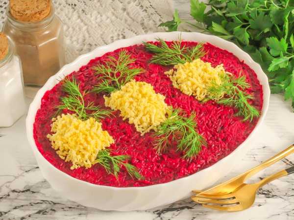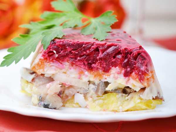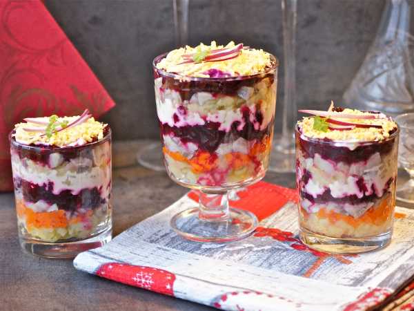 Последний слой - свекольный. Салат в салатнике (салатниках) отправим в холодильник пропитываться на 2 часа.