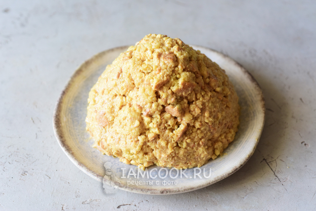 Полученную массу выложим на плоское блюдо, придавая ей руками форму муравьиной горки. Блюдо с такой заготовкой тортика отправим в холодильник на 4-5 часов.