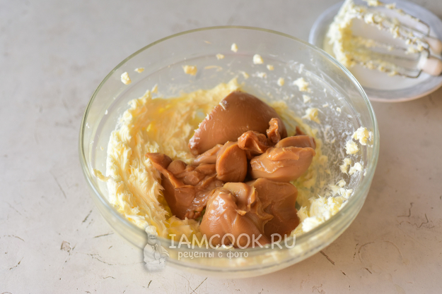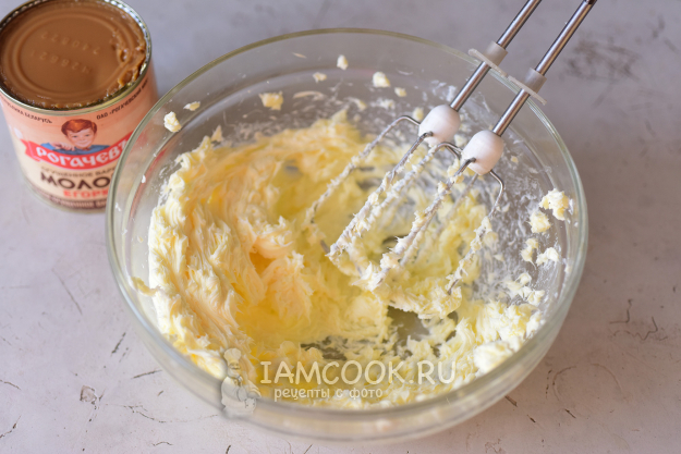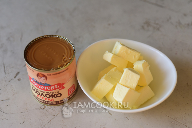 Пока выпекается песочная основа, приготовим крем. Для крема нам понадобятся вареная сгущенка и мягкое сливочное масло.