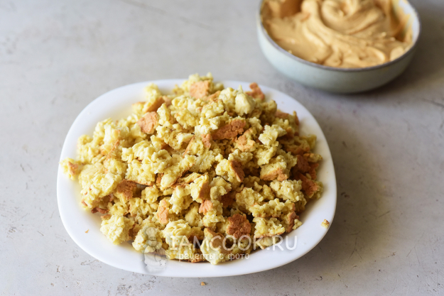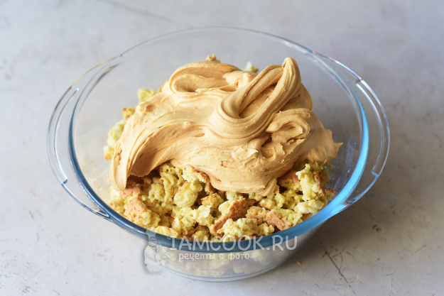 Поломанные кусочки выложим в миску, добавим к ним приготовленный крем. Руками всё перемешаем до полного соединения всех составляющих.