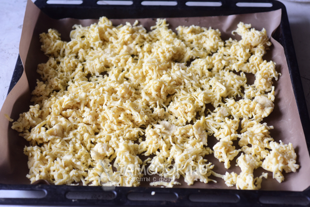 Хорошо охлажденное тесто натрем на крупной терке - можно сделать это сразу на противень. Предварительно желательно застелить противень пергаментом для выпекания.