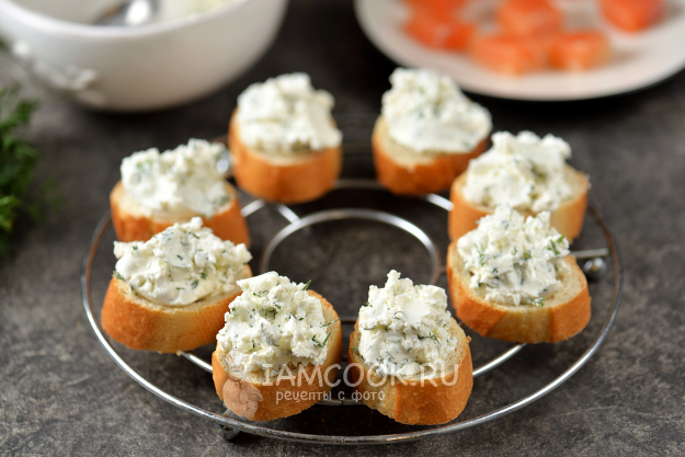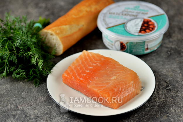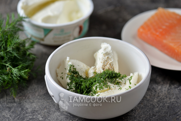 А пока переложите маскарпоне или любой творожно-сливочный сыр в глубокую мисочку, добавьте нарубленный укроп, чуть соли и перца по вкусу. Перемешайте массу до однородности. При желании в начинку можно добавить немного лимонного сока, если любите его кислинку в сочетании с рыбными продуктами.