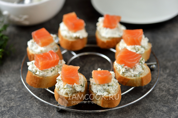 Переложите тарталетки на решетку, дайте им остыть, а потом наполните творожной массой. Нарежьте соленую рыбу крупным кубиком.