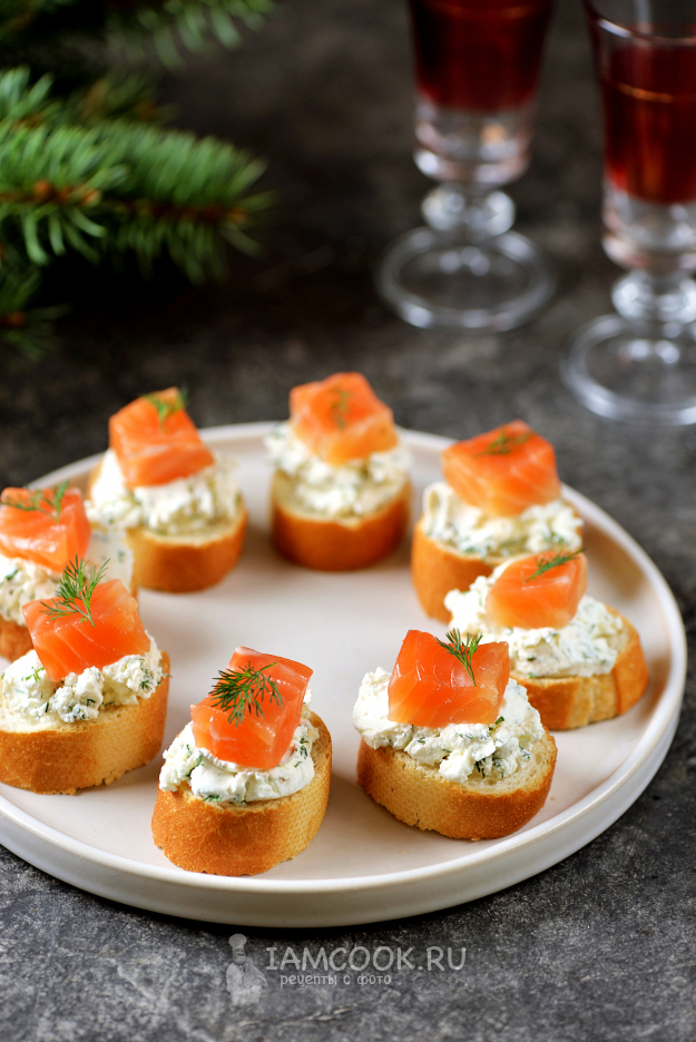Тарталетки из багета с красной рыбой готовы! Украсьте веточкой укропа и можно подавать. Это отличная закуска для домашнего праздничного застолья.