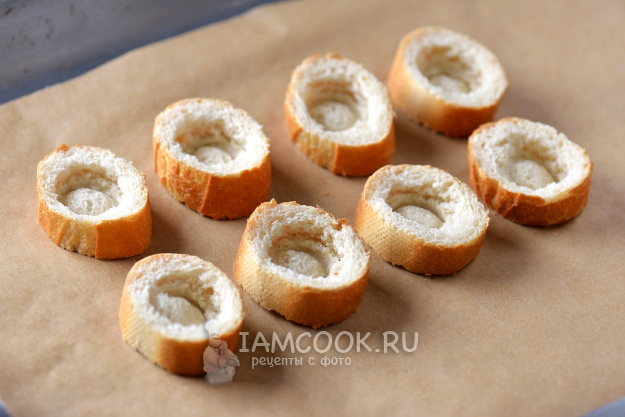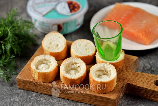 Нарежьте багет толщиной около 1 сантиметра, выложите на разделочную доску, мякиш придавите рюмкой небольшого диаметра.