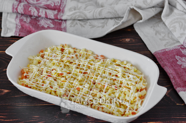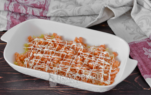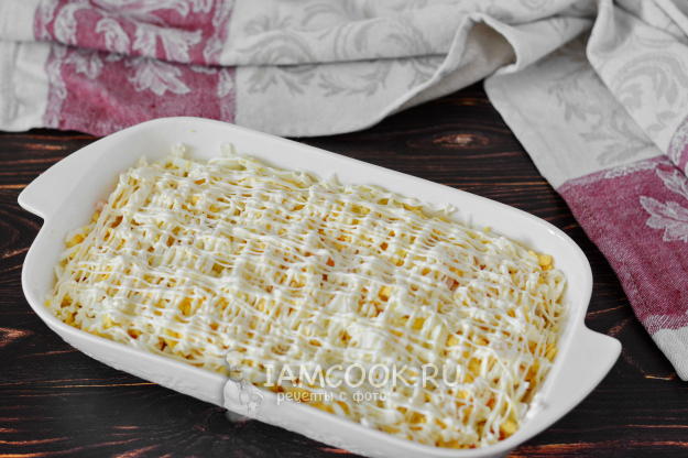 Верхнюю сеточку майонеза сделайте более обильной. Салату нужно дать постоять в холодильнике пару часов для пропитки.