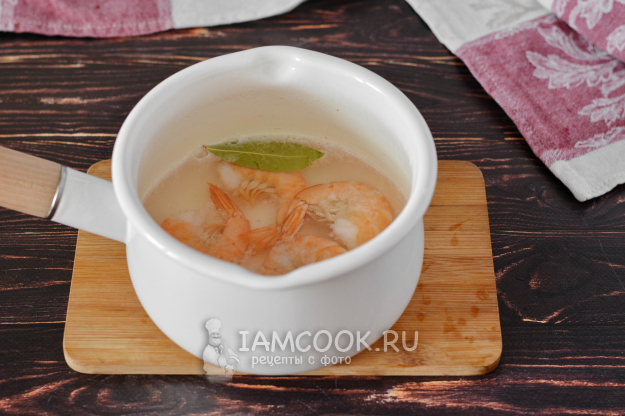 Если же креветки, как у меня, сырые (серого цвета), то их нужно сварить. Для этого залейте креветок небольшим количеством воды, чуть подсолите, добавьте лавровый лист и отварите около 2-х минут с момента закипания. После чего откиньте на сито, дайте остыть и очистите от панциря.