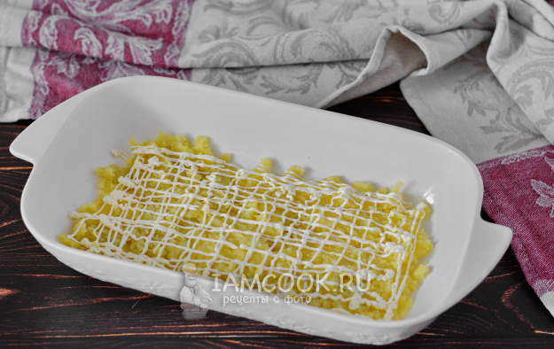 Салат лучше делать в глубоком блюде-шубнице. Первым слоем выкладываем натёртый на крупной тёрке картофель, поверх картофеля делаем сеточку майонеза.