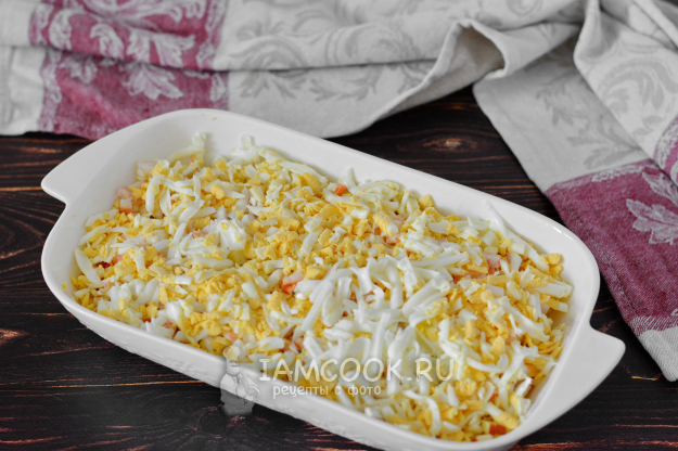 Ну и последний слой - натёртые на крупной тёрке куриные яйца. Их можно чуточку подсолить.