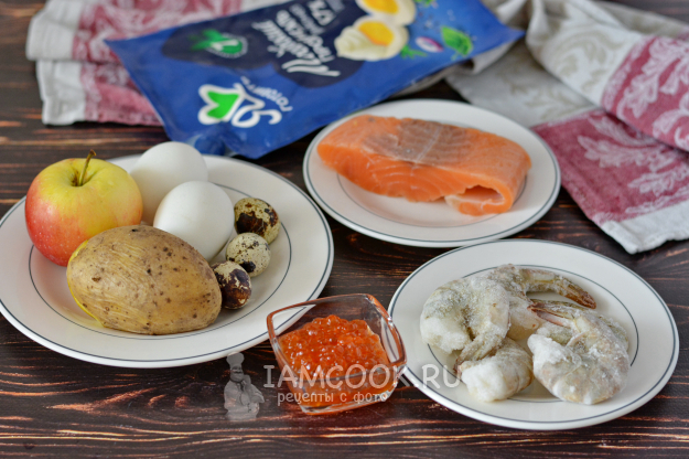 Чтобы приготовить салат «Царская шуба» с красной рыбой и креветками, понадобятся продукты из списка ингредиентов.