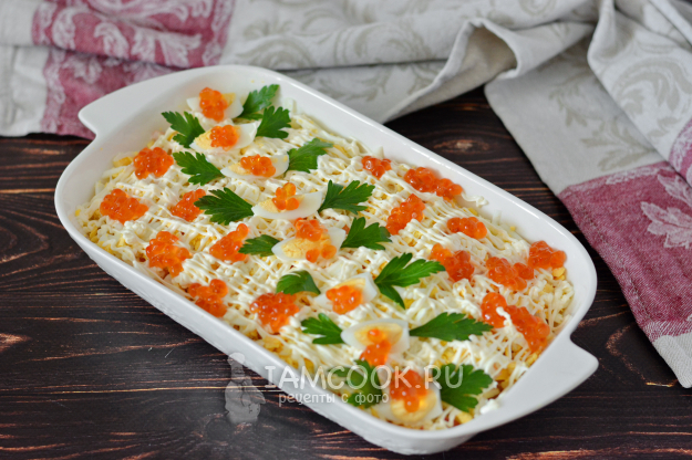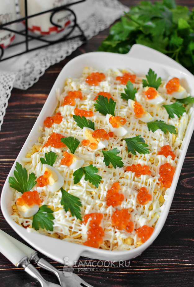 Салат «Царская шуба» с красной рыбой (семгой) и икрой просто шикарен! Он всегда пользуется популярностью.