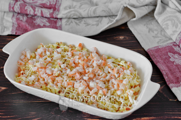Теперь очередь креветок. Крупных креветок нужно нарезать, а мелких можно положить целиком. Этот слой также покрываем майонезной сеточкой.