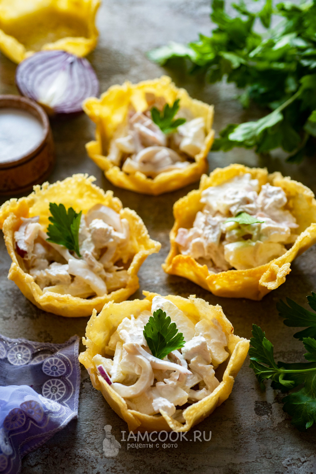 Я заполнила все тарталетки из сыра салатом «Русалочка» с кальмарами, подала к столу - всем очень понравилось! Приятного аппетита!