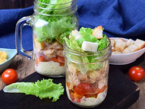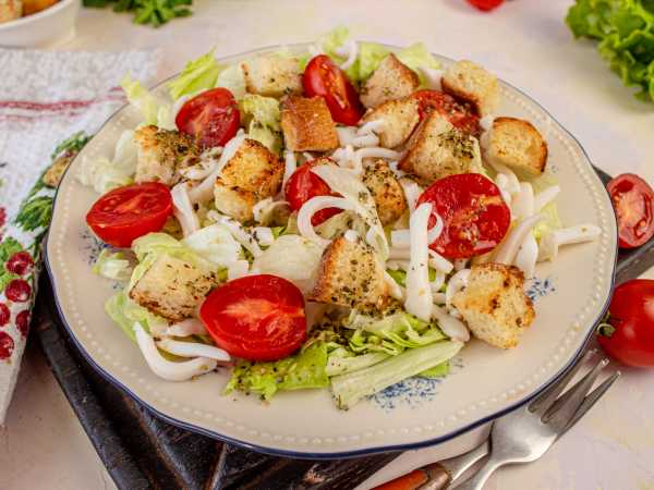 Добавьте шарики моцареллы и сухарики. Осталось только полить салат вкусной заправкой.