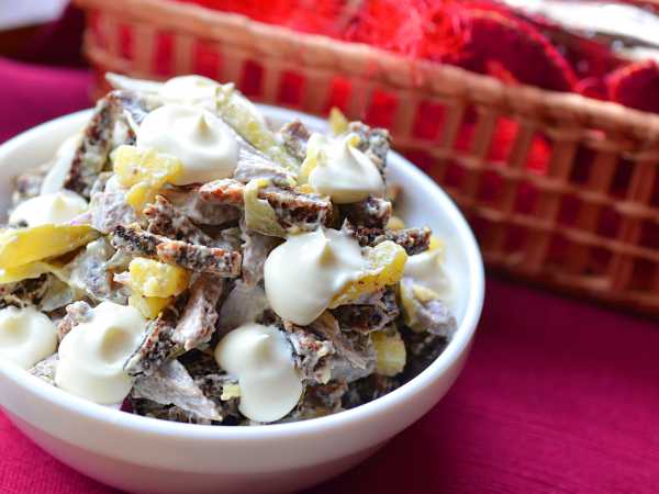 Продукты для салата «Переполох» с курицей подготовьте по списку ингредиентов.