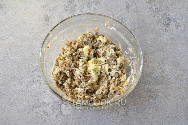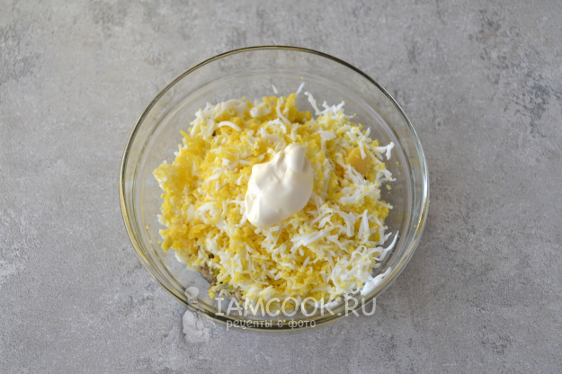 Добавьте к шпротам натертые на мелкой терке яйца. Добавьте майонез.