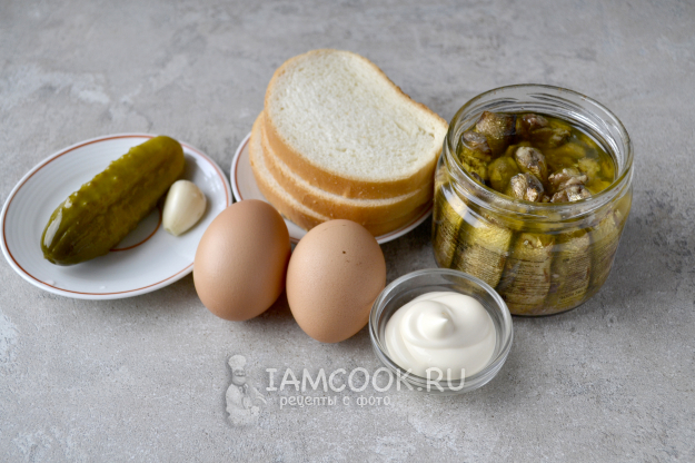 Чтобы приготовить бутерброды со шпротами и яйцом, понадобятся продукты из списка ингредиентов. За основу можно взять белый батон или багет. Яйца сварите вкрутую, залейте холодной водой и полностью охладите.