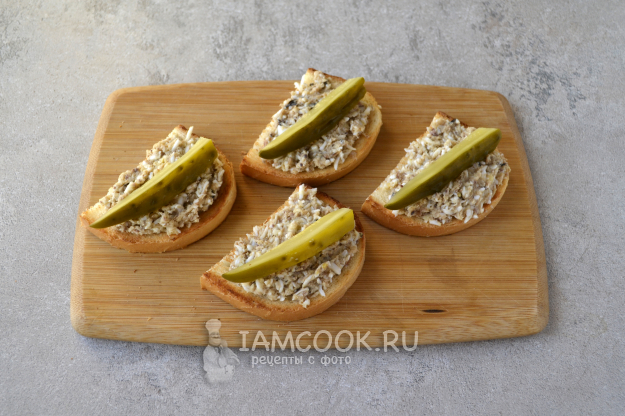 Маринованный огурчик разрежьте на тонкие ломтики. Положите по ломтику огурца на каждый кусочек хлеба.