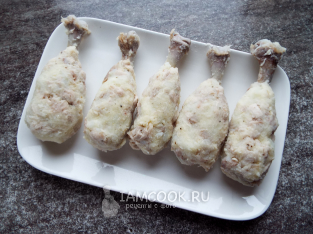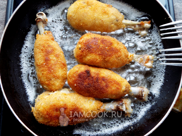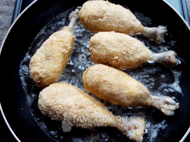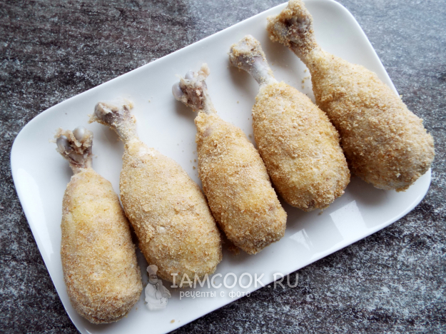 Обвалять "ножки" в муке, затем в яйце и в панировочных сухарях.