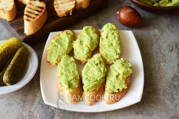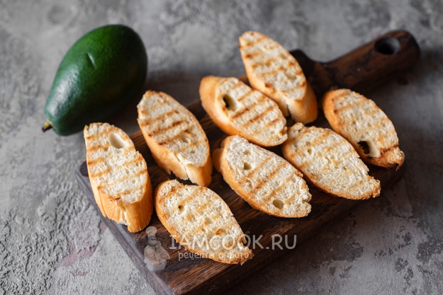 Пастой из авокадо намажем обжаренные ломтики багета.