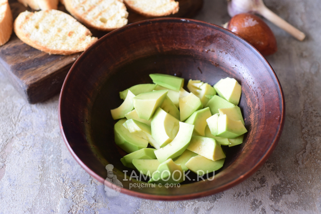 Авокадо разрежем на две части, очистим от кожуры, удалим косточку, нарежем на произвольные кусочки, выложим в миску.