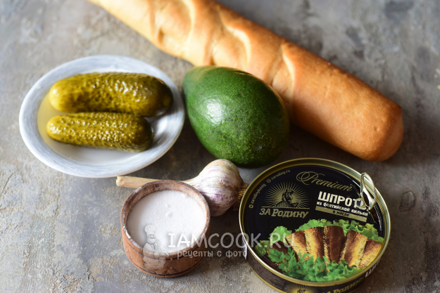 Подготовим необходимые ингредиенты для бутербродов со шпротами и авокадо. Чеснок почистим, авокадо помоем, багет нарежем на ломтики.