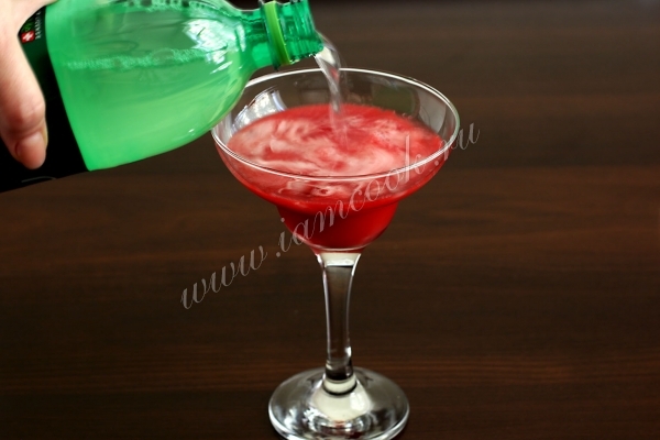 Добавить в бокал взбитые ингредиенты и долить спрайт или содовую до наполнения бокала.