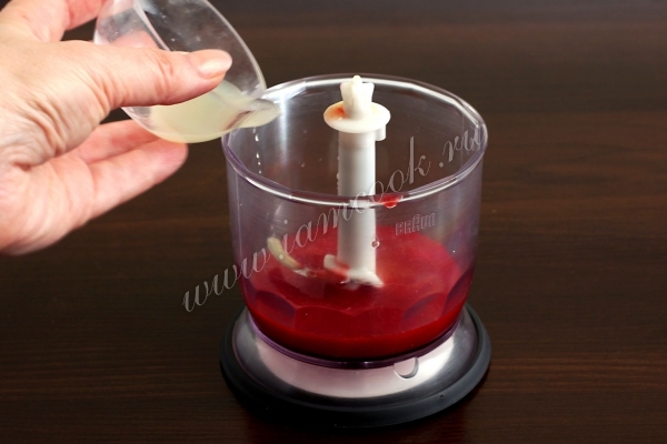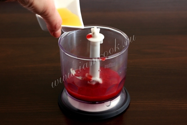 В блендере соединить малиновое пюре, сироп Гренадин, добавить сок апельсина.