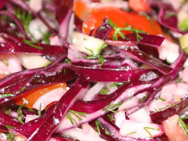 Можно готовить салат из белокочанной капусты, но мне очень нравится по виду и структуре именно с красной. Салат выглядит ярко и долго остаётся в "форме".