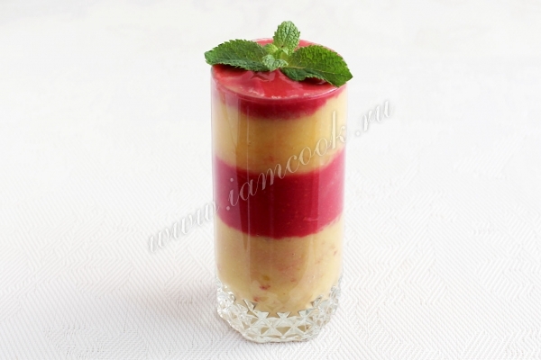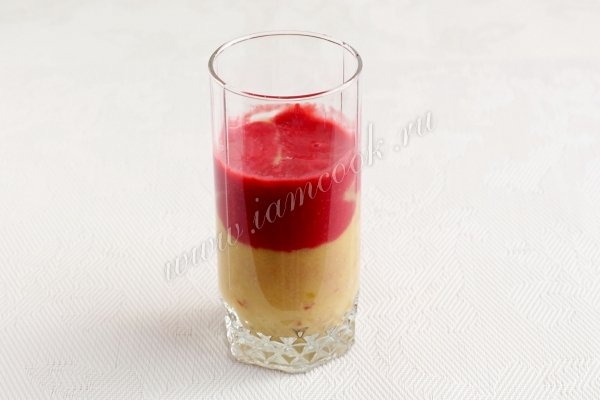 По очереди наливать в стакан сначала персиковый смузи, затем малиновый. Лить нужно по стеночке, слегка наклоняя стакан.