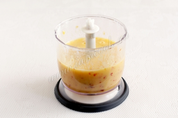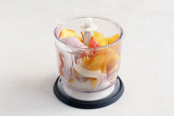 Сначала приготовим персиковый смузи. Для этого персики нарежем и поместим в блендер. Добавим часть меда и часть кефира.