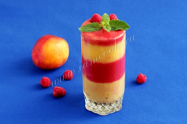 Хочу представить вашему вниманию еще один вид смузи - персик и малину. Интересная подача слоями привлекает внимание к рецепту и очень нравится детям. Сладость готового смузи можно варьировать по своему вкусу, так как она зависит от спелости и сладости самих фруктов. Советую попробовать, тем более, что по этому рецепту все готовится очень быстро и не сложно.