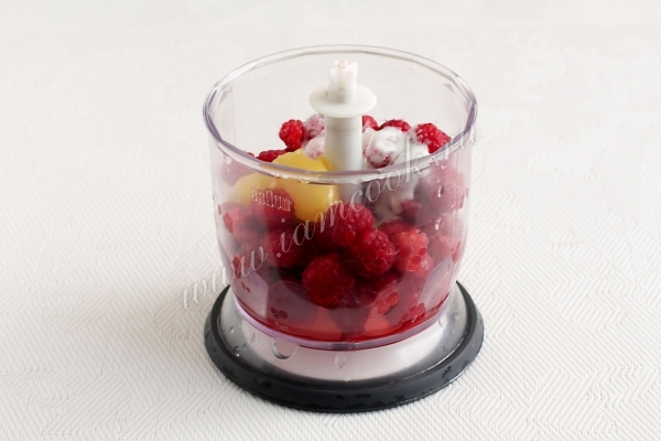 Сложить в чистый блендер ягоды малины, мед и кефир. Все взбить.