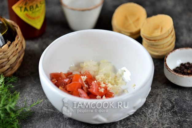 Помидоры черри нарежьте мелким кубиком, переложите в глубокую миску, добавьте пропущенный через пресс чеснок и измельченный репчатый лук.
