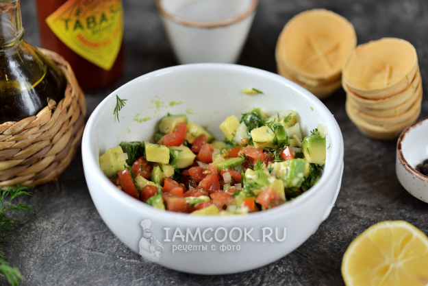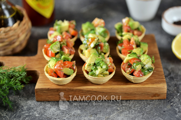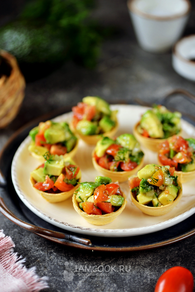 Салат с авокадо в тарталетках готов! Очень вкусная и полезная закуска на один укус.