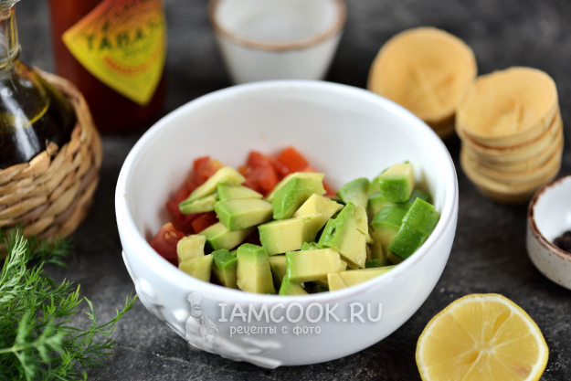 Авокадо разрежьте вдоль пополам, удалите косточку, срежьте кожуру. Мякоть нарежьте кубиком, добавьте в миску, полейте его сразу лимонным соком.