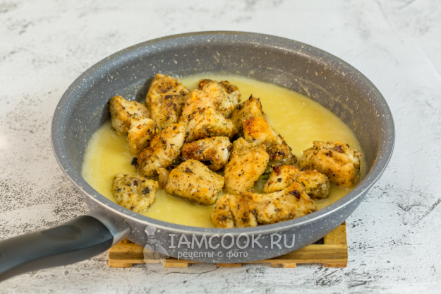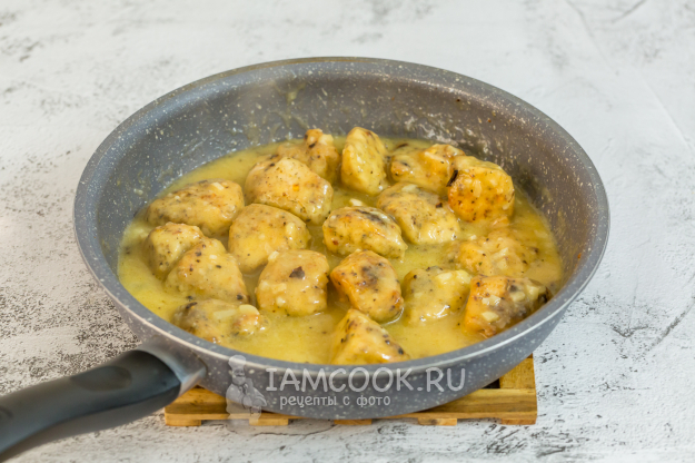 Прогрейте курицу в чесночном соусе на сковороде, помешивая.