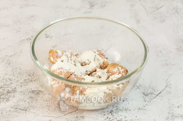 Добавьте муку и перемешайте так, чтобы каждый кусочек был в муке.