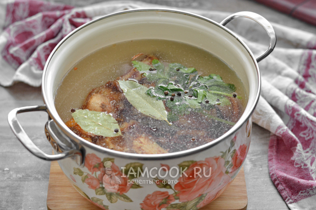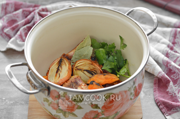 После чего переложите кости, лук и морковь в кастрюлю, добавьте петрушку (можно ограничиться только стеблями), лавровый лист и перец горошком.