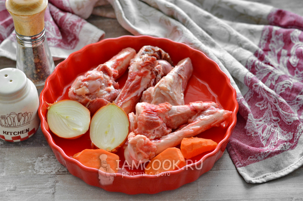 Набор продуктов для коричневого бульона - это кости, лук, коренья и специи. Ну и вода, конечно. Если используются кости трубчатые, то их нужно распилить или разрубить, чтобы открыть костный мозг, находящийся внутри. Он даст дополнительный вкус бульону.