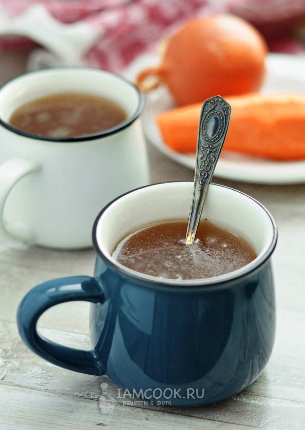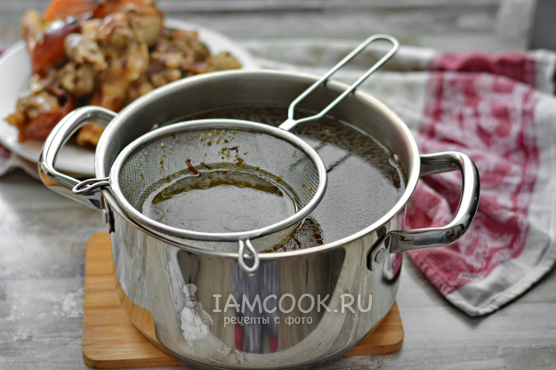 После варки извлеките из бульона кости, лук и морковь, а бульон процедите.