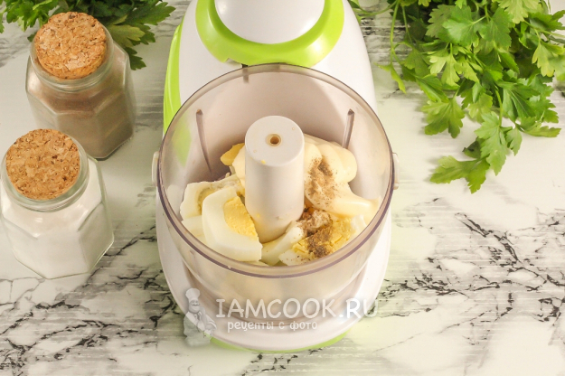 Нарежьте яйца кубиками и выложите в чашу блендера или измельчителя. Добавьте майонез либо сметану любой жирности, соль и молотый черный перец. Много соли не всыпайте, так как шпроты и так солоноваты на вкус.