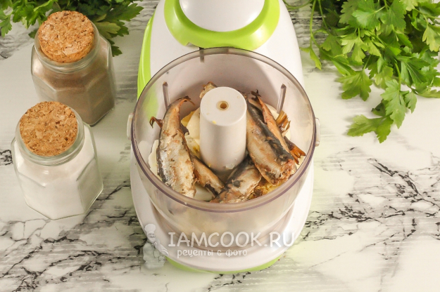 Выложите рыбку в чашу измельчителя. Можно сюда же добавить и масло, в котором шпроты консервировали, но тогда не нужно добавлять майонез. Иначе блюдо получится слишком жирным. На этом этапе допустимо всыпать измельченную зелень.