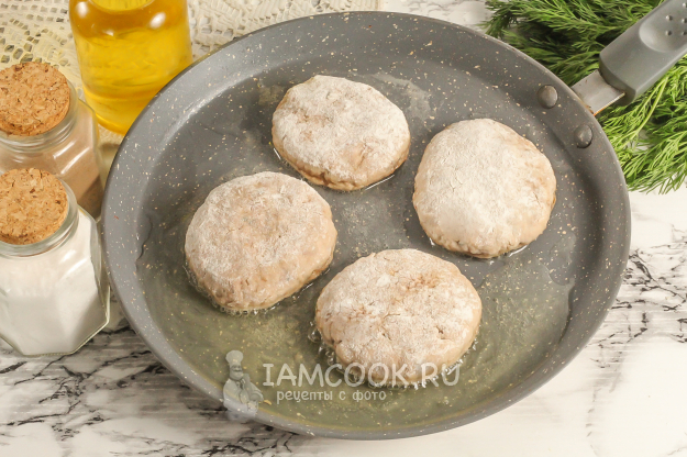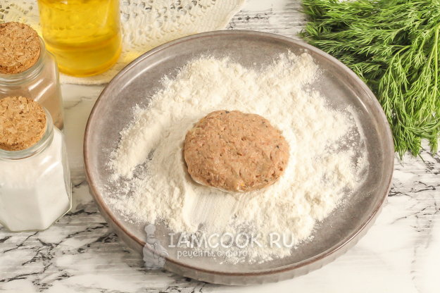 Всыпьте пшеничную муку высшего сорта на тарелку или блюдце. Разделите котлетную массу на части и вылепите из них заготовки. Обваляйте с обеих сторон в муке.