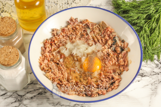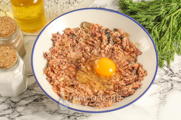 Вскройте консервы и выложите в глубокую емкость всё содержимое. Удалите крупные кости, если таковые присутствуют. Лучше, конечно, приобретать, стружку рыбы в масле - в ней нет косточек. Помните всю массу вилкой, проверьте еще раз ее на наличие косточек, особенно если котлеты будут кушать и дети! Вбейте в емкость куриное яйцо. Его можно заменить 3 перепелиными яйцами.