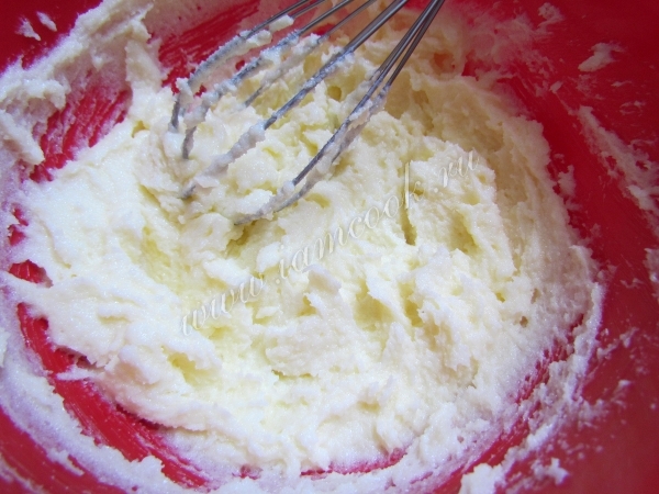 Размягченное сливочное масло соедините с сахаром и ванильным сахаром и взбейте в пышную массу.